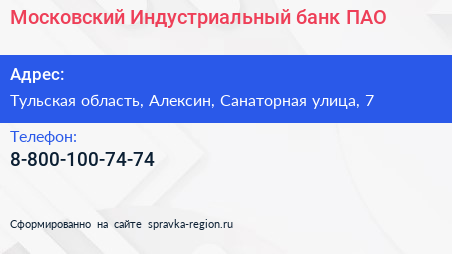 Московский Индустриальный банк, ПАО по адресу Тульская область, Алексин, Санаторная улица, 7 в дальнейшем Организация, размещена в следующих категориях:
