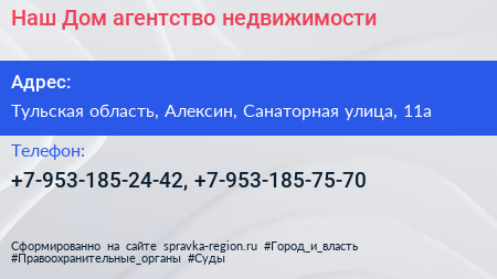 Наш Дом, агентство недвижимости по адресу Тульская область, Алексин, Санаторная улица, 11а в дальнейшем Организация, размещена в следующих категориях: