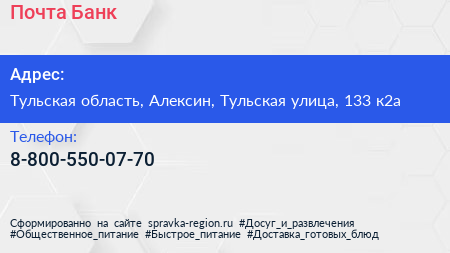 Почта Банк по адресу Тульская область, Алексин, Тульская улица, 133 к2а в дальнейшем Организация, размещена в следующих категориях: