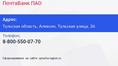 ПочтаБанк, ПАО по адресу Тульская область, Алексин, Тульская улица, 26 в дальнейшем Организация, размещена в следующих категориях: