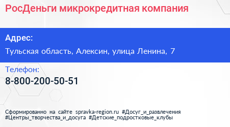 РосДеньги, микрокредитная компания по адресу Тульская область, Алексин, улица Ленина, 7 в дальнейшем Организация, размещена в следующих категориях: