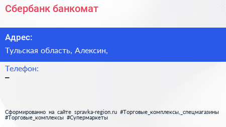 Сбербанк, банкомат по адресу Тульская область, Алексин, в дальнейшем Организация, размещена в следующих категориях: