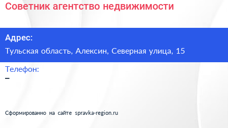 Советник, агентство недвижимости по адресу Тульская область, Алексин, Северная улица, 15 в дальнейшем Организация, размещена в следующих категориях:
