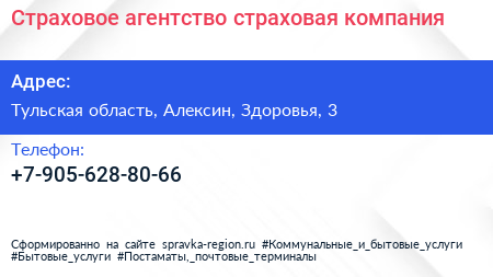 Страховое агентство, страховая компания по адресу Тульская область, Алексин, Здоровья, 3 в дальнейшем Организация, размещена в следующих категориях: