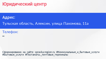 Юридический центр по адресу Тульская область, Алексин, улица Пахомова, 11а в дальнейшем Организация, размещена в следующих категориях: