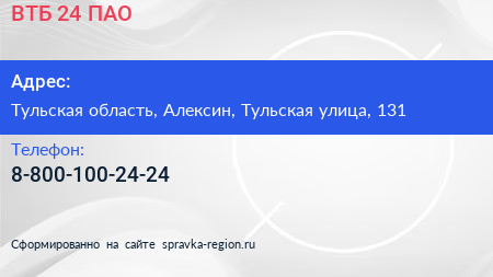 ВТБ 24, ПАО по адресу Тульская область, Алексин, Тульская улица, 131 в дальнейшем Организация, размещена в следующих категориях: