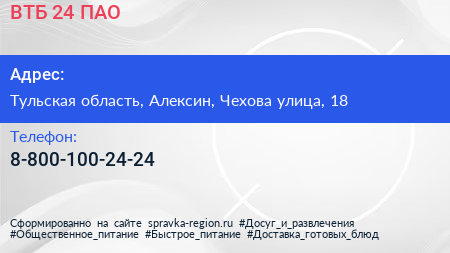 ВТБ 24, ПАО по адресу Тульская область, Алексин, Чехова улица, 18 в дальнейшем Организация, размещена в следующих категориях: