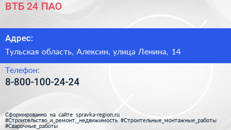 ВТБ 24, ПАО по адресу Тульская область, Алексин, улица Ленина, 14 в дальнейшем Организация, размещена в следующих категориях: