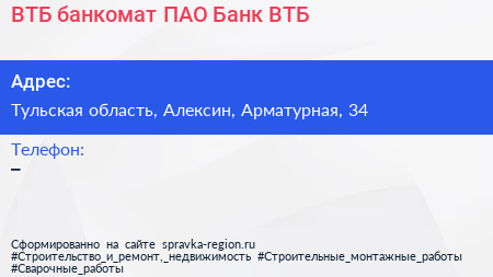 ВТБ, банкомат, ПАО Банк ВТБ по адресу Тульская область, Алексин, Арматурная, 34 в дальнейшем Организация, размещена в следующих категориях: