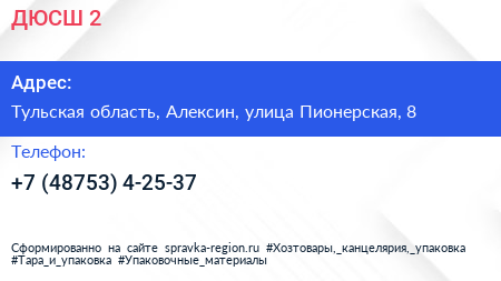 ДЮСШ №2 по адресу Тульская область, Алексин, улица Пионерская, 8 в дальнейшем Организация, размещена в следующих категориях: