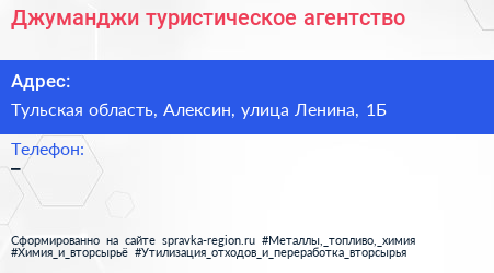 Джуманджи, туристическое агентство по адресу Тульская область, Алексин, улица Ленина, 1Б в дальнейшем Организация, размещена в следующих категориях: