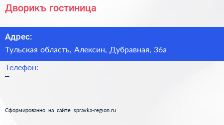 Дворикъ, гостиница по адресу Тульская область, Алексин, Дубравная, 36а в дальнейшем Организация, размещена в следующих категориях: