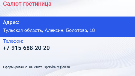 Салют, гостиница по адресу Тульская область, Алексин, Болотова, 18 в дальнейшем Организация, размещена в следующих категориях: