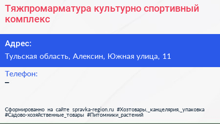 Тяжпромарматура, культурно-спортивный комплекс по адресу Тульская область, Алексин, Южная улица, 11 в дальнейшем Организация, размещена в следующих категориях: