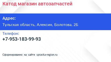 Катод, магазин автозапчастей по адресу Тульская область, Алексин, Болотова, 2Б в дальнейшем Организация, размещена в следующих категориях: