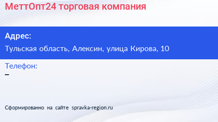 МеттОпт24, торговая компания по адресу Тульская область, Алексин, улица Кирова, 10 в дальнейшем Организация, размещена в следующих категориях: