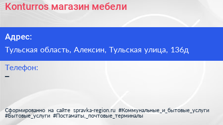 Konturros, магазин мебели по адресу Тульская область, Алексин, Тульская улица, 136д в дальнейшем Организация, размещена в следующих категориях: