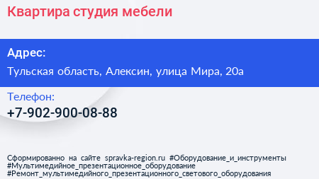 Квартира, студия мебели по адресу Тульская область, Алексин, улица Мира, 20а в дальнейшем Организация, размещена в следующих категориях: