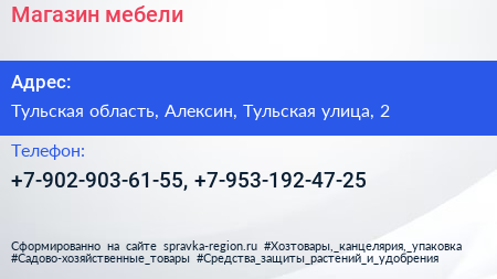 Магазин мебели по адресу Тульская область, Алексин, Тульская улица, 2 в дальнейшем Организация, размещена в следующих категориях: