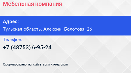 Мебельная компания по адресу Тульская область, Алексин, Болотова, 26 в дальнейшем Организация, размещена в следующих категориях: