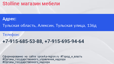 Stolline, магазин мебели по адресу Тульская область, Алексин, Тульская улица, 136д в дальнейшем Организация, размещена в следующих категориях: