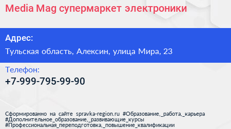 Media Mag, супермаркет электроники по адресу Тульская область, Алексин, улица Мира, 23 в дальнейшем Организация, размещена в следующих категориях: