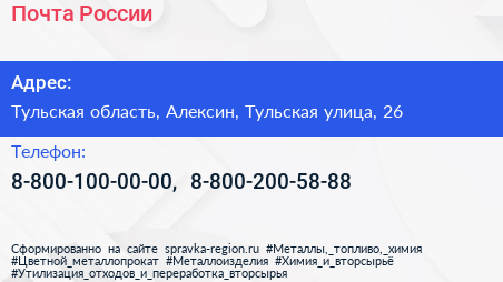 Почта России по адресу Тульская область, Алексин, Тульская улица, 26 в дальнейшем Организация, размещена в следующих категориях: