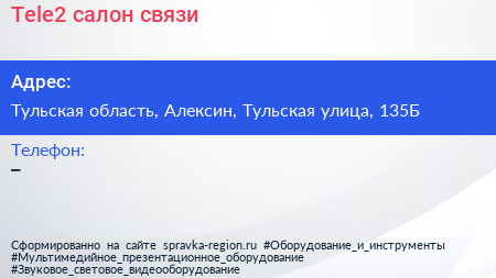 Tele2, салон связи по адресу Тульская область, Алексин, Тульская улица, 135Б в дальнейшем Организация, размещена в следующих категориях:
