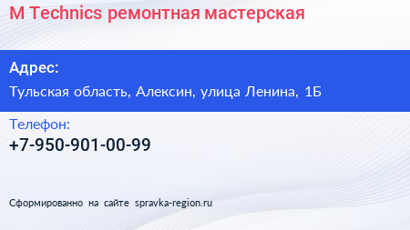 M-Technics, ремонтная мастерская по адресу Тульская область, Алексин, улица Ленина, 1Б в дальнейшем Организация, размещена в следующих категориях: