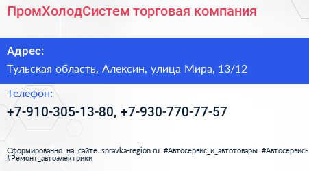 ПромХолодСистем, торговая компания по адресу Тульская область, Алексин, улица Мира, 13/12 в дальнейшем Организация, размещена в следующих категориях: