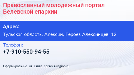 Православный молодежный портал Белевской епархии по адресу Тульская область, Алексин, Героев Алексинцев, 12 в дальнейшем Организация, размещена в следующих категориях: