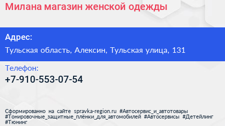 Милана, магазин женской одежды по адресу Тульская область, Алексин, Тульская улица, 131 в дальнейшем Организация, размещена в следующих категориях: