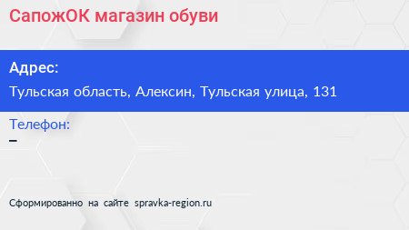 СапожОК, магазин обуви по адресу Тульская область, Алексин, Тульская улица, 131 в дальнейшем Организация, размещена в следующих категориях: