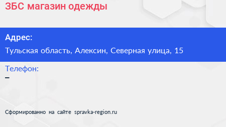 ЗБС, магазин одежды по адресу Тульская область, Алексин, Северная улица, 15 в дальнейшем Организация, размещена в следующих категориях: