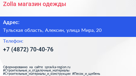 Zolla, магазин одежды по адресу Тульская область, Алексин, улица Мира, 20 в дальнейшем Организация, размещена в следующих категориях: