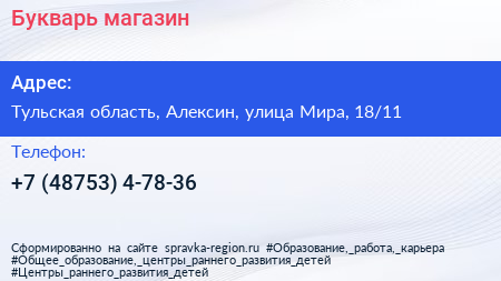 Букварь, магазин по адресу Тульская область, Алексин, улица Мира, 18/11 в дальнейшем Организация, размещена в следующих категориях: