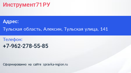 Инструмент71.РУ по адресу Тульская область, Алексин, Тульская улица, 141 в дальнейшем Организация, размещена в следующих категориях: