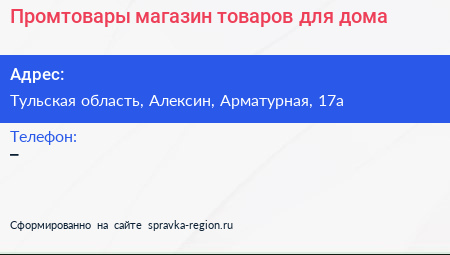 Промтовары, магазин товаров для дома по адресу Тульская область, Алексин, Арматурная, 17а в дальнейшем Организация, размещена в следующих категориях: