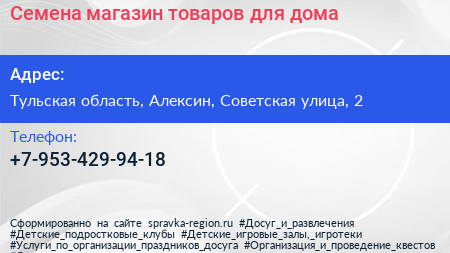 Семена, магазин товаров для дома по адресу Тульская область, Алексин, Советская улица, 2 в дальнейшем Организация, размещена в следующих категориях:
