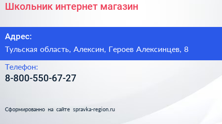 Школьник, интернет-магазин по адресу Тульская область, Алексин, Героев Алексинцев, 8 в дальнейшем Организация, размещена в следующих категориях: