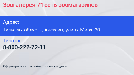 Зоогалерея 71, сеть зоомагазинов по адресу Тульская область, Алексин, улица Мира, 20 в дальнейшем Организация, размещена в следующих категориях: