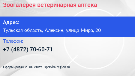 Зоогалерея, ветеринарная аптека по адресу Тульская область, Алексин, улица Мира, 20 в дальнейшем Организация, размещена в следующих категориях: