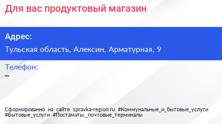 Для вас, продуктовый магазин по адресу Тульская область, Алексин, Арматурная, 9 в дальнейшем Организация, размещена в следующих категориях: