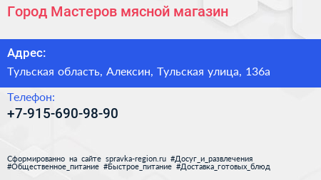 Город Мастеров, мясной магазин по адресу Тульская область, Алексин, Тульская улица, 136а в дальнейшем Организация, размещена в следующих категориях:
