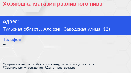 Хозяюшка, магазин разливного пива по адресу Тульская область, Алексин, Заводская улица, 12а в дальнейшем Организация, размещена в следующих категориях: