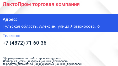 ЛактоПром, торговая компания по адресу Тульская область, Алексин, улица Ломоносова, 6 в дальнейшем Организация, размещена в следующих категориях: