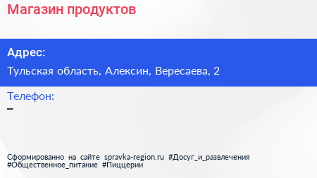 Магазин продуктов по адресу Тульская область, Алексин, Вересаева, 2 в дальнейшем Организация, размещена в следующих категориях: