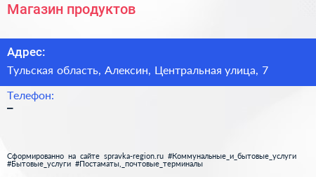 Магазин продуктов по адресу Тульская область, Алексин, Центральная улица, 7 в дальнейшем Организация, размещена в следующих категориях: