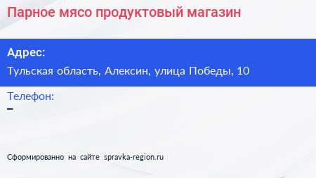 Парное мясо, продуктовый магазин по адресу Тульская область, Алексин, улица Победы, 10 в дальнейшем Организация, размещена в следующих категориях: