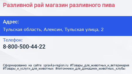 Разливной рай, магазин разливного пива по адресу Тульская область, Алексин, Тульская улица, 2 в дальнейшем Организация, размещена в следующих категориях: